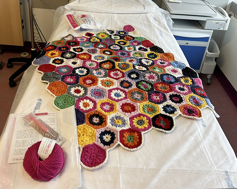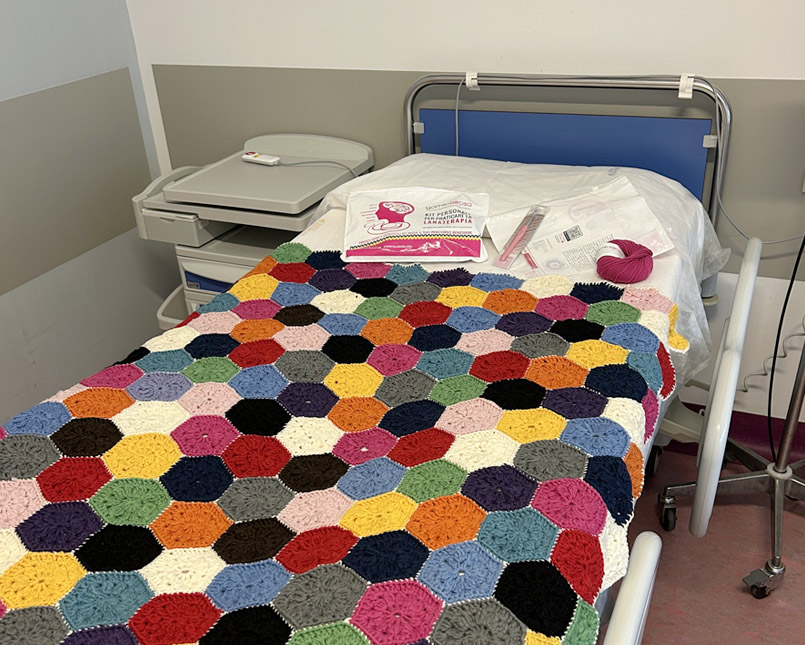 Susanna, Graziella, Donatella, Isabella e Cristina, si recano in questo ospedale tutti i martedì dalle 9.00 alle 12.00 e si mettono in sala d’aspetto a sferruzzare sostenendo con i loro insegnamenti le pazienti che incuriosite si avvicinano per lavorare insieme i coloratissimi esagoni che si trasformano poi in bellissime coperte. Proprio prima di Natale, alcune di queste copertine sono state donate al DH oncologico ed hanno portato un’ondata di colore e amore in quelle stanze, rendendo molto più solidale il periodo natalizio e i giorni a seguire.