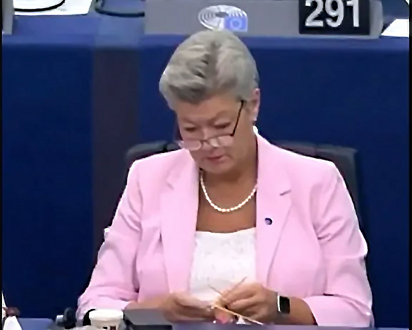 Il viso serio della Commissaria Johansson può dare l’impressione di una assenza, o di una mancanza di attenzione verso ciò che accade intorno a lei, ma non è così. Al contrario, la sua percezione della realtà è potenziata e la sua mente è libera da ogni distrazione, il che le permette di ascoltare parola per parola il discorso della Presidente, senza perderne una virgola.